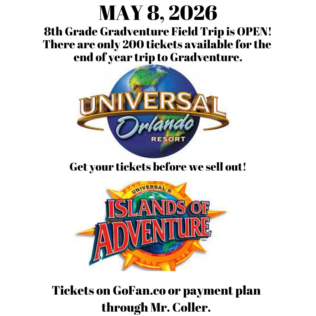 Gradventure 2026 – 8th Grade Trip – Reserve your space today! by Angela Murphy | Dec 13, 2025 | School News, Slider Tickets available on GoFan.co at https://gofan.co/event/5656982?schoolId=FL78402.