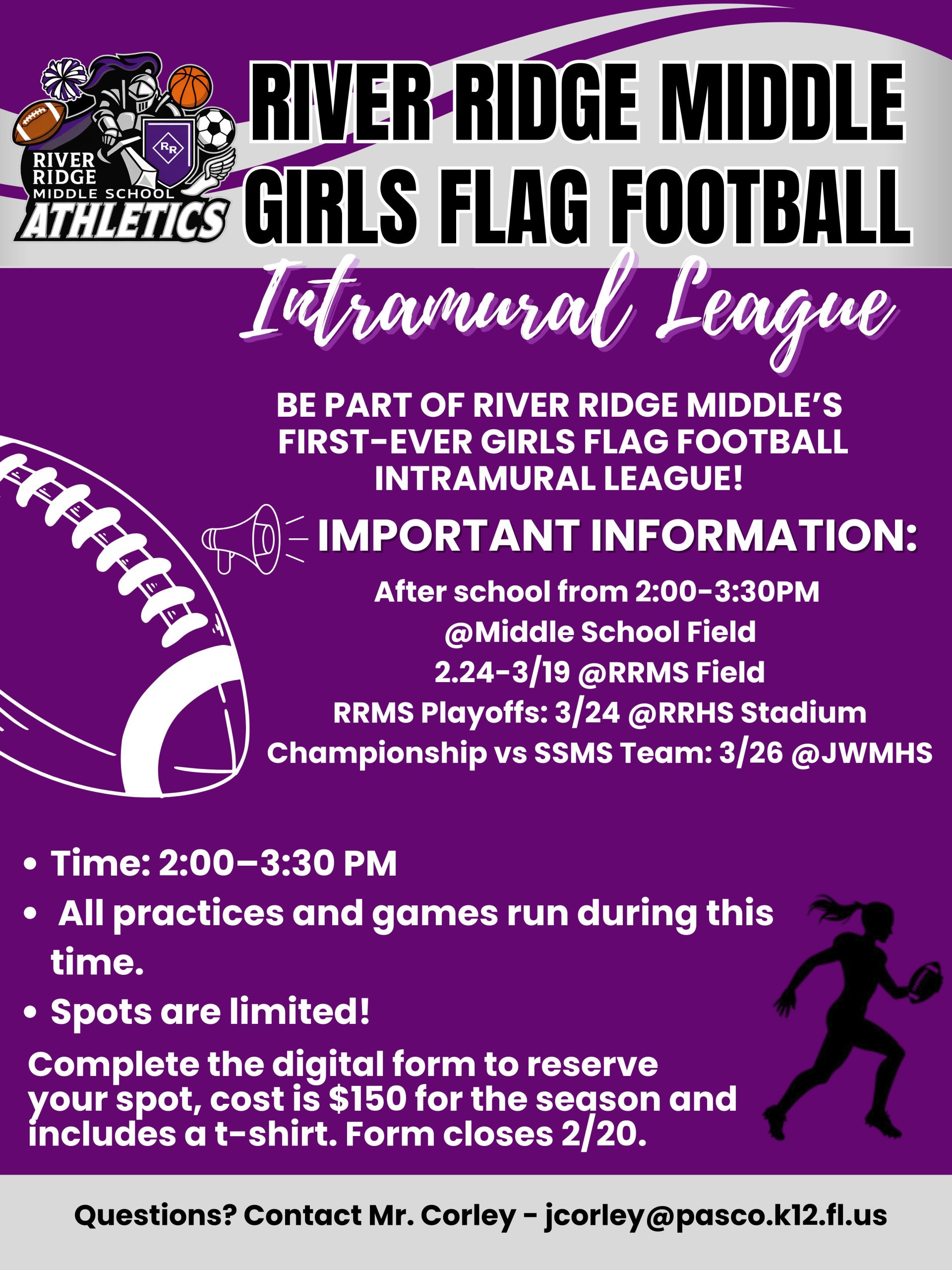 We are excited to launch the RRMS Girls’ Flag Football League. If you would like to register, please complete the form at this link by February 20th: 2026 River Ridge Middle School Flag Football League – Fill out form. The cost to participate is $150, and you will receive a t-shirt. The evaluation day is February 24th, and teams will be determined based on this day. Practices begin on February 26th on the middle school fields from 2 PM-3:30 PM on Tuesdays and Thursdays, with games to follow. If you have questions or need more information, please contact Mr. Corley at jcorley@pasco.k12.fl.us.