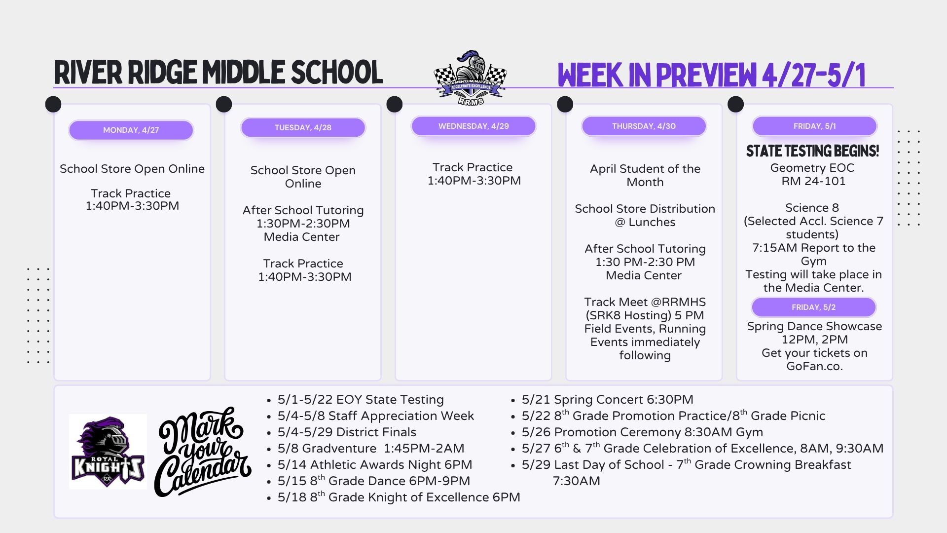 As we move into the upcoming week, we are excited about the continued learning, engagement, and opportunities planned for our students. State testing begins this week, and students will receive their testing dates and locations in their first period classes. However, we have chosen to schedule students by teacher and class period this year, so they can determine their testing schedule based on this criterion before receiving their reminder. More information on end-of-year testing is available on the RRMS website at this link: RRMS Spring Testing Information 2026.